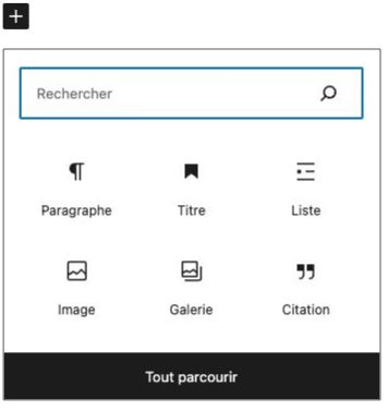Les blocs affichés dans la fenêtre sont les plus utilisés sur le site. Il est possible d’en trouver d’autres en faisant une recherche ou de consulter la liste complète des blocs en cliquant sur “Tout parcourir”.