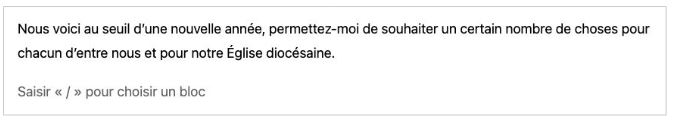 Pour ajouter des blocs autres que du texte, cliquez sur le bouton “+” en fin de ligne et choisissez le bloc souhaité.