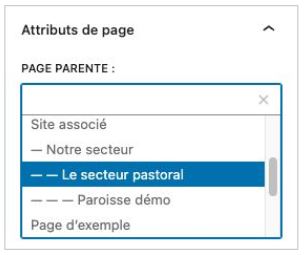 Définissez la page parente dans l’onglet “Attribut de page” de la colonne de droite. Pour que la page bénéficie du modèle de rendu avec une bannière affichant son arborescence et une barre latérale affichant ses pages sœurs, celle-ci devra être une descendante de la page “Site associé”.