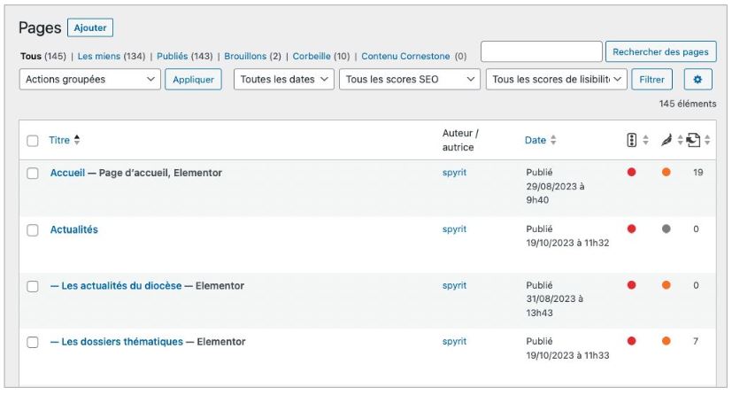 Des filtres et une recherche sont disponibles pour trouver une page précise. Les résultats sont paginés.