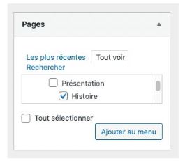 Pour ajouter des pages au menu, cochez les entrées dans la colonne de gauche puis cliquez sur “Ajouter au menu”.
