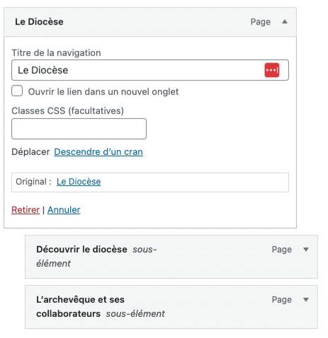 En dépliant les entrées de menu, vous pouvez modifier le “Titre de la navigation” pour remplacer le texte affiché dans le menu.