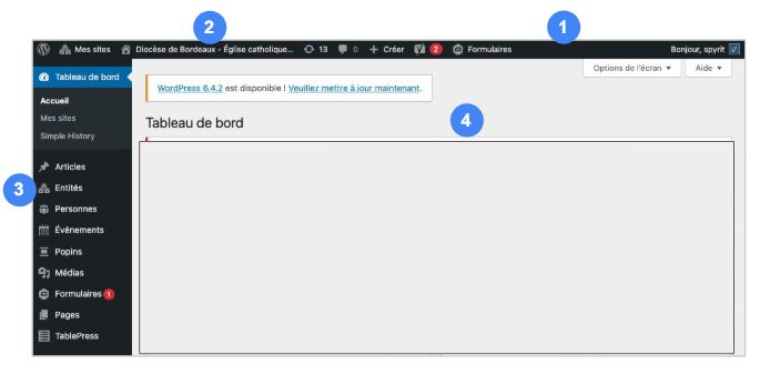 - Zone de contenu des pages d’administration : La zone principale de l’écran (4) où s’affichent les contenus et les outils de gestion en fonction de la section choisie dans la barre latérale.